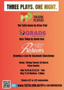 Playlovers joins with the Irish Theatre Players and GRADS Theatre Company to present a fast, gripping One-Act Season on the stage at Stirling Theatre.